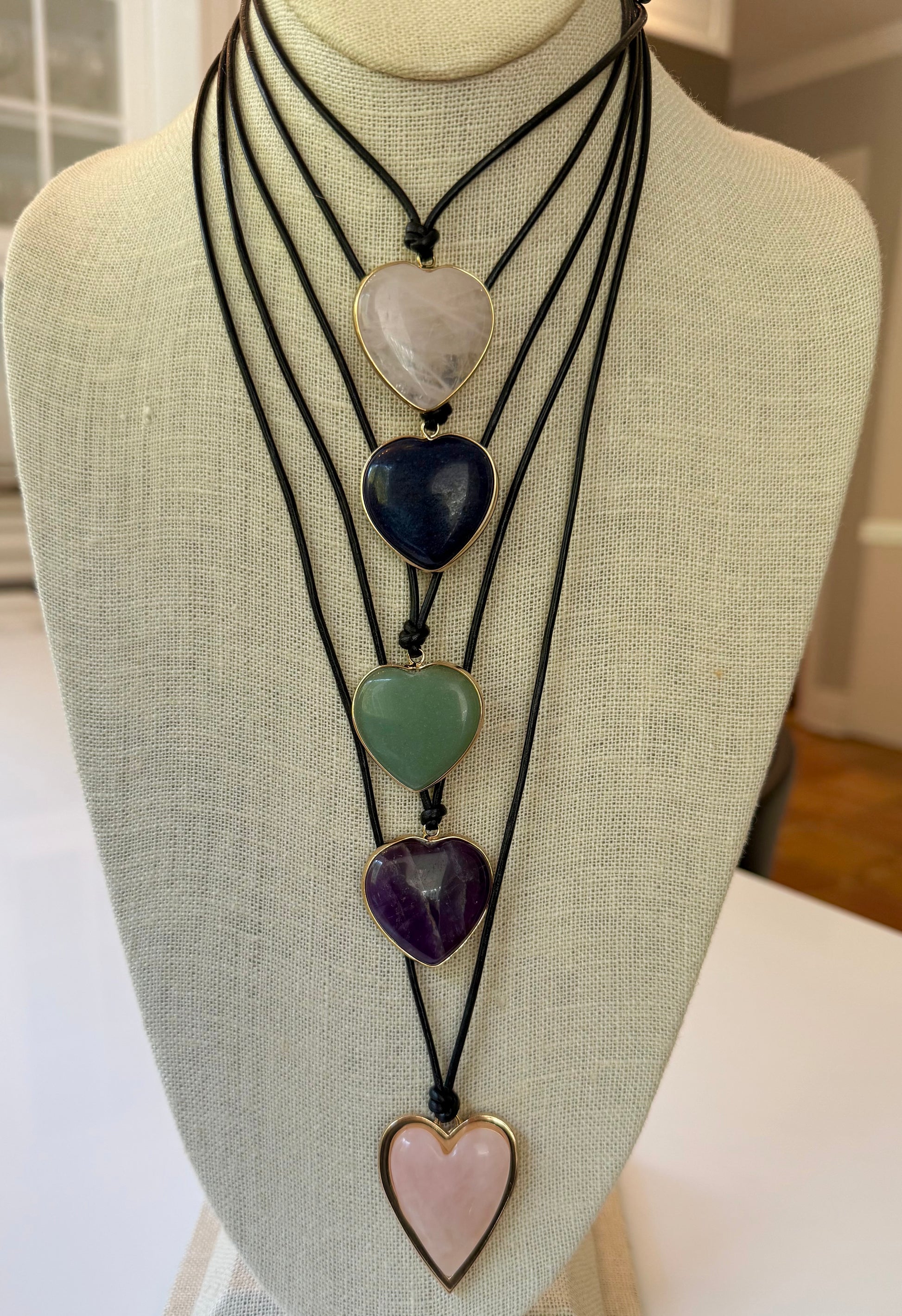 - 1" Semi precious hearts on sliding leather adjustable cord